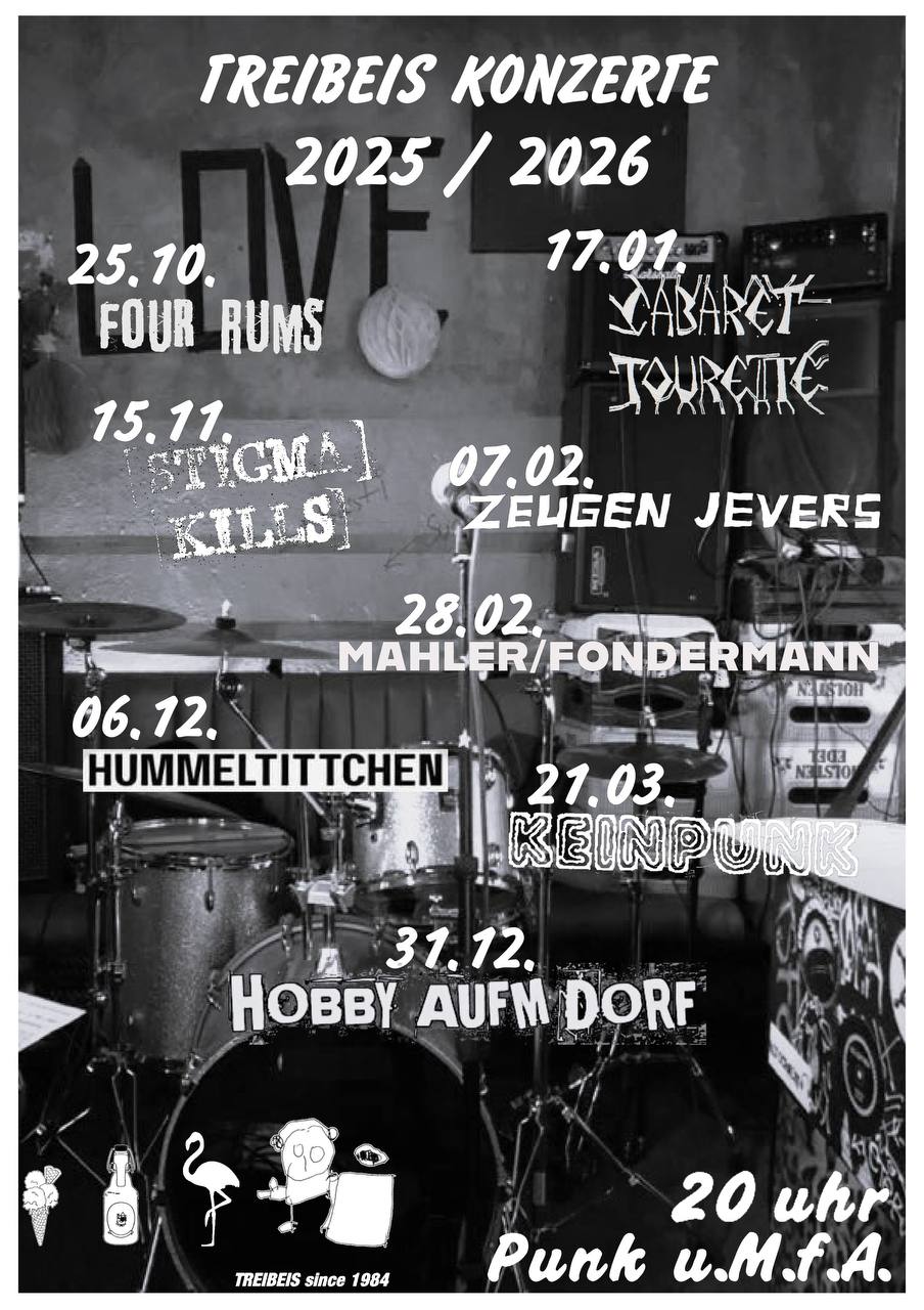 Jo! Grillerei vorbei, Sommer auch und doch bleibt ein Licht am Horizont: die Four Rums eröffnen die diesjährige Konzertreihe im Treibi! Am Samstag, den 25. Oktober gehts los. Türen ab 20h, Konzert dann irgendwann. Aber nicht zu spät, Nachbarn wa. Klickt auf "mehr", wenn ihr wissen wollt, wer sonst noch so auftritt die nächsten Monate. Wir sehen uns!